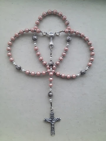 Elizabeth's beautiful keepsake rosary is made with 6 mm white Swarovski crystal pearls for the Aves. The Paters are sterling silver plated 3-D roses. The spacers are a light pink Czech pressed glass seed bead. This rosary features a mother and child centerpiece and the fluer crucifix.